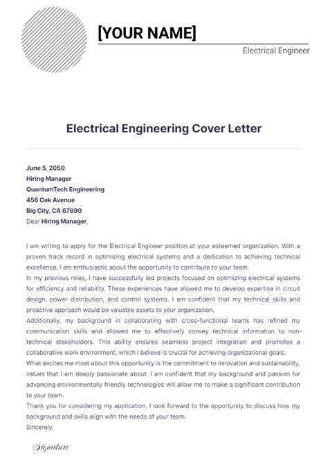 The cover letter sample for electrical engineer below expresses similar essential skills and experience. Masters, as a highly skilled electronics engineer, i read your posting for a new electronics engineer with interest. The job description of an electrical engineer ranges from. • chemical engineering cover letter examples for various career fields from the broadest sense, cover letters serve two purposes: I believe i am suitably qualified with a degree in electrical engineering, relevant work experience and the skillset required to make a positive and valuable. If you're ready to apply for your next role, upload your resume to indeed resume to get started. Workbloom's resume templates all come with matching cover letters. Use this electrical engineer cover letter sample as inspiration but don't copy it entirely. Create cover letter dear sir or madam: Talk about your (relevant) coursework. It is with great enthusiasm that i submit my application for the regional manager for electrical services position. Lowell, this letter is in direct response to your advertisement for an electrical design engineer for brett manufacturing. Electrical engineer cover letter template (text format) marshall mendoza.